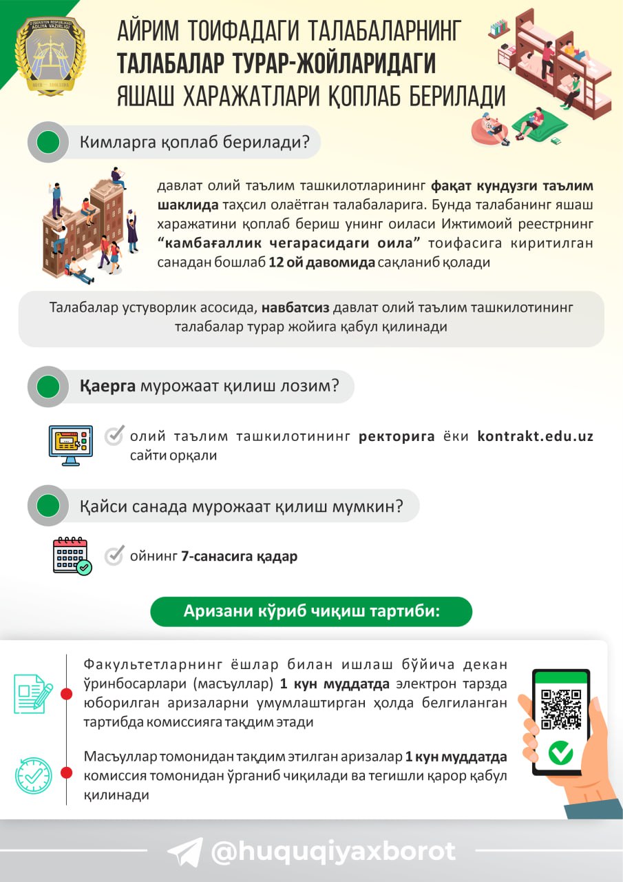 Ayrim talabalarga turar-joylaridagi yashash harajatlari qoplab beriladi