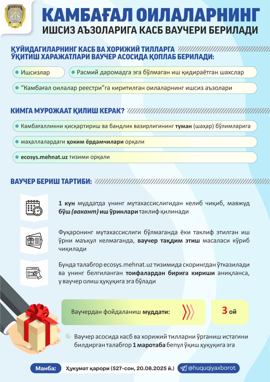 Kambag'al oilalarning ishsiz a'zolariga kasb vaucheri beriladi